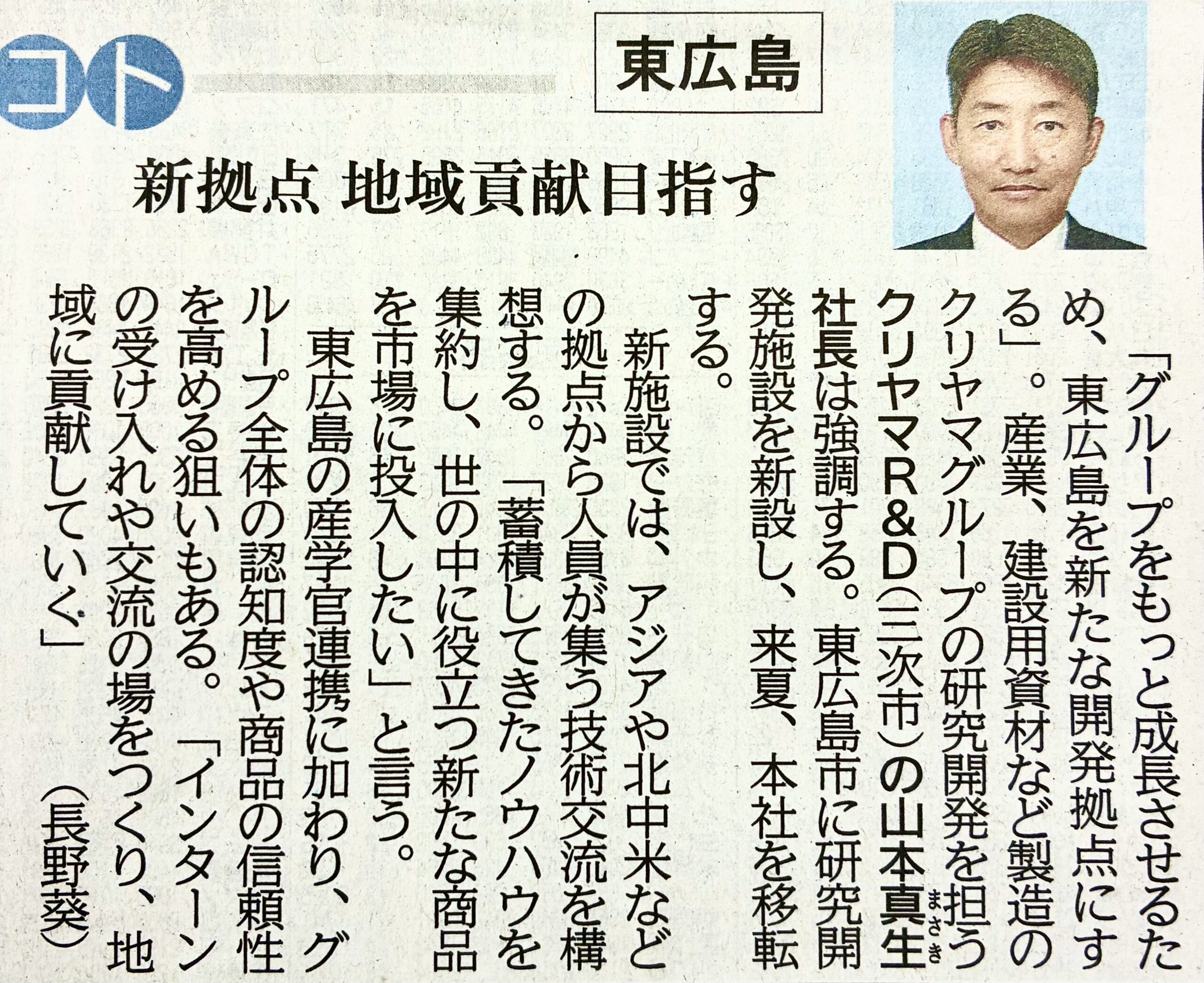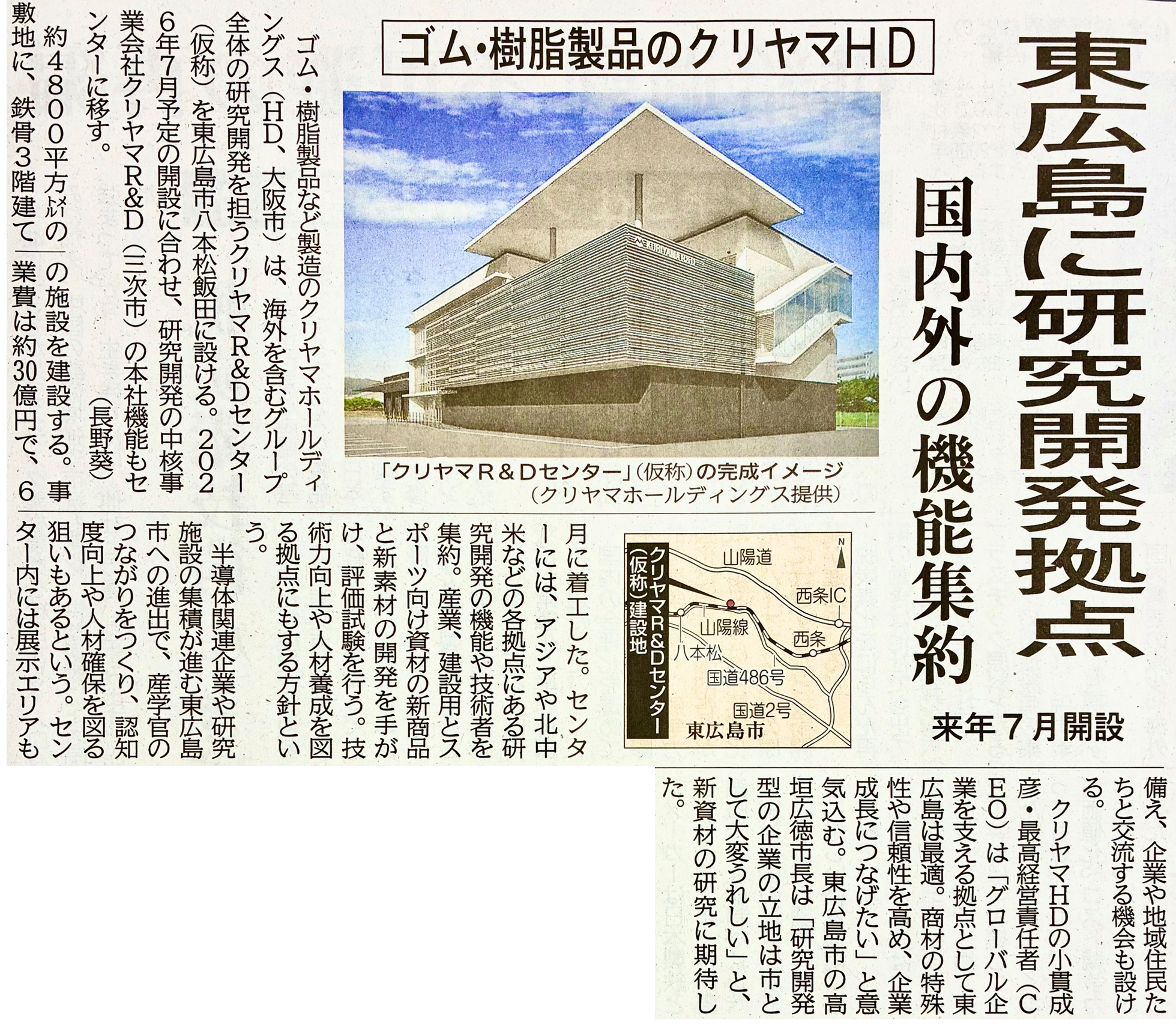 当社は、2026年7月頃に、グローバルベースで新たな付加価値を創造する総合研究開発施設として、「クリヤマR&Dセンター(仮称)」を広島県東広島市に開設いたします。